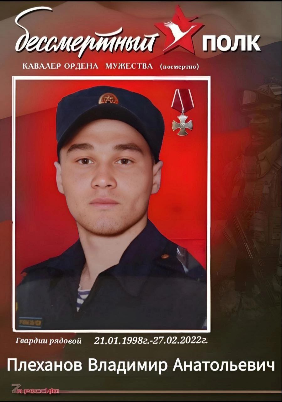 27 февраля 2022 года гвардии рядовой Владимир Анатольевич Плеханов, единственный сын своих родителей, погиб смертью храбрых в окрестностях города Новая Каховка Херсонской области, до последней минуты своей жизни исполнив свой воинский долг!